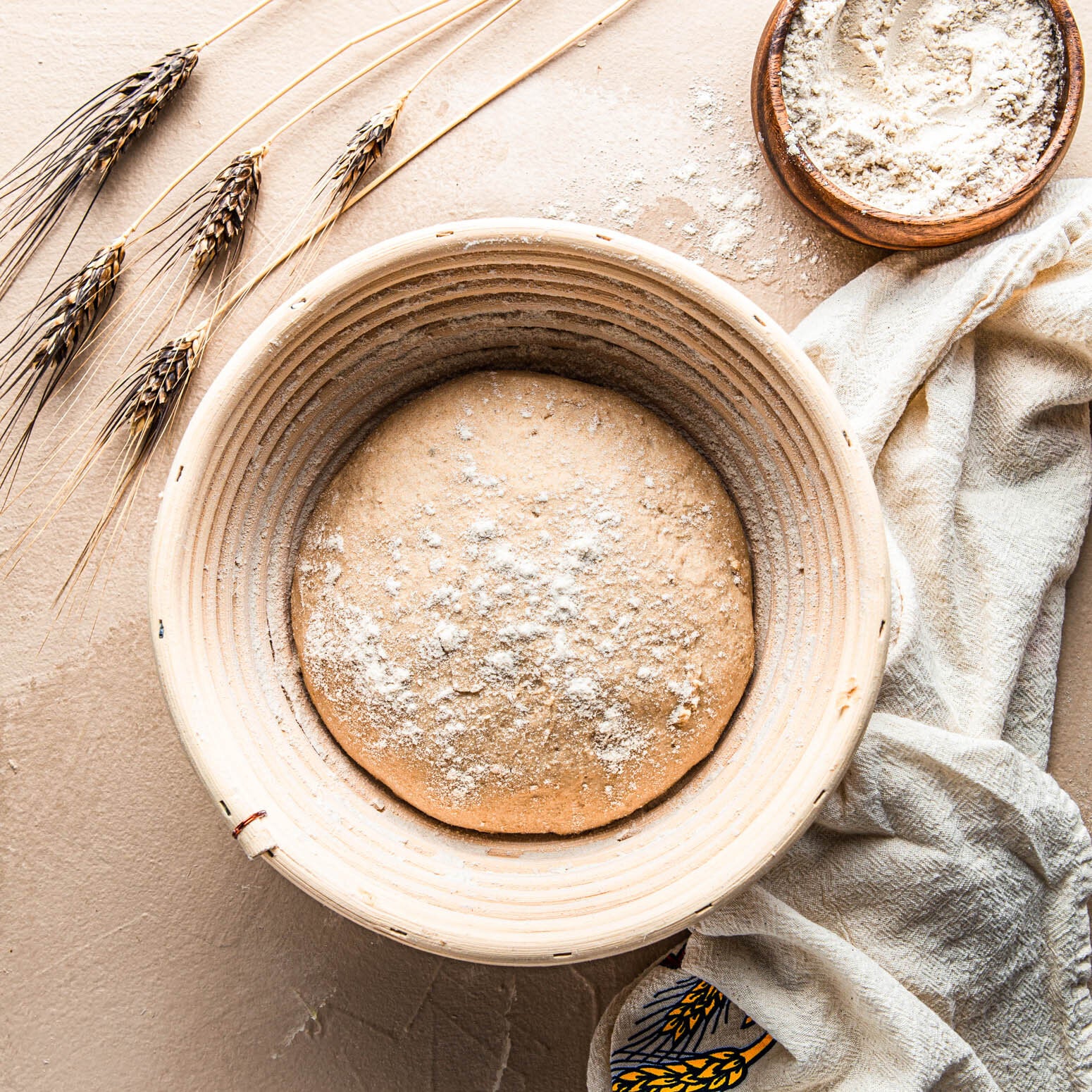 Generously coat the basket with flour (shaking out excess), before placing your dough for a final proof to add a decorative coil pattern to your homemade loaves of bread. Cover with our tea towel while the dough rises.